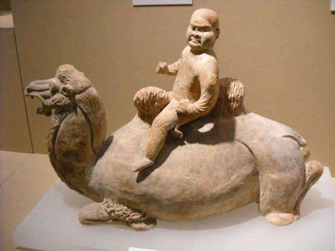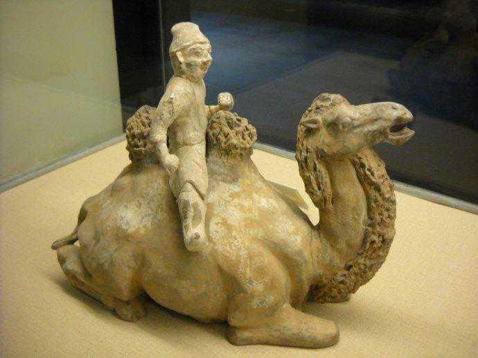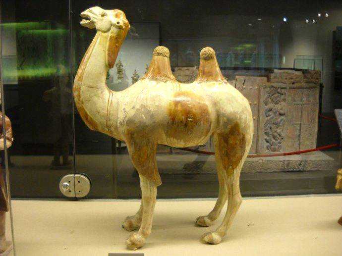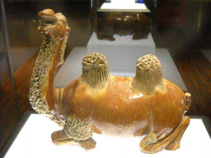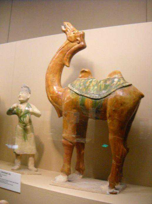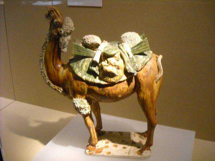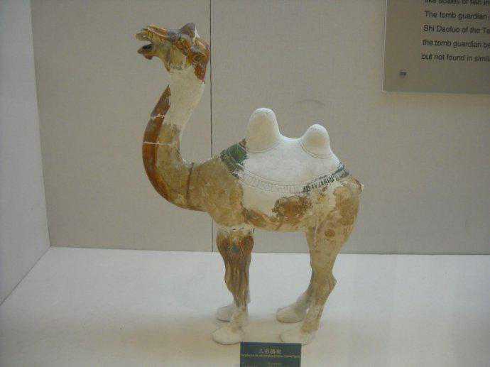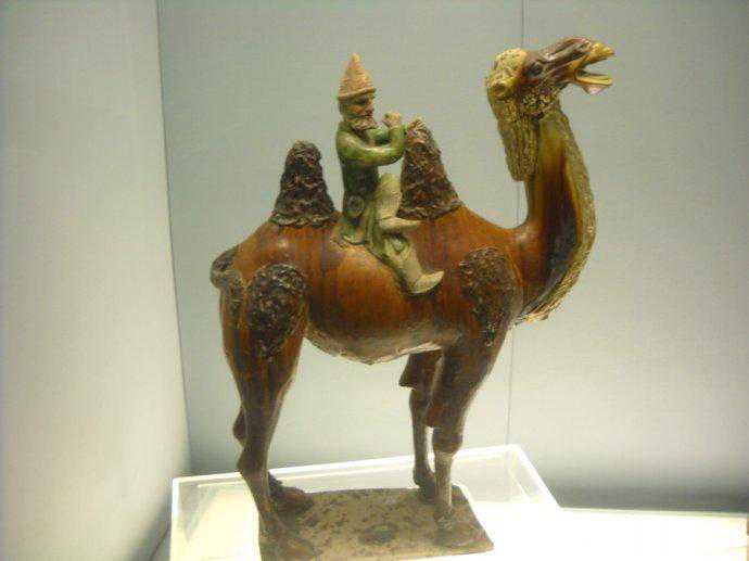 唐代彩绘三彩釉陶骆驼及牵骆驼俑赏析博文中展示的是唐代时期的“彩绘三彩釉陶骆驼及牵骆驼俑”。唐代對駱駝俑人的形塑,成就亦十分出色。駱駝早在南北朝時期已出現於隨葬明器中,到了隋唐,駱駝成為絲綢之路和兩京聯絡時最常見的交通工具,單峰、雙峰、或卧或立,有將起立前行狀的,也有負行李正待起程的,有邁步前行的。有張嘴嘶鳴的,有载奏乐俑的。充分反映了巧工良匠敏銳的觀察力和細密的工藝技術。