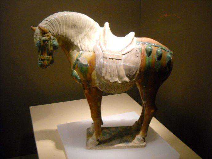 彩绘三彩釉陶马是唐代时期最令人喜爱的,造型均头小颈长,膘肥体壮,骨肉健美,眼睛炯炯有神,富于艺术的概括力。三彩釉陶马以白色三彩和黑色三彩最为名贵,以黄、绿、褐三彩为主的原则上价值略低。