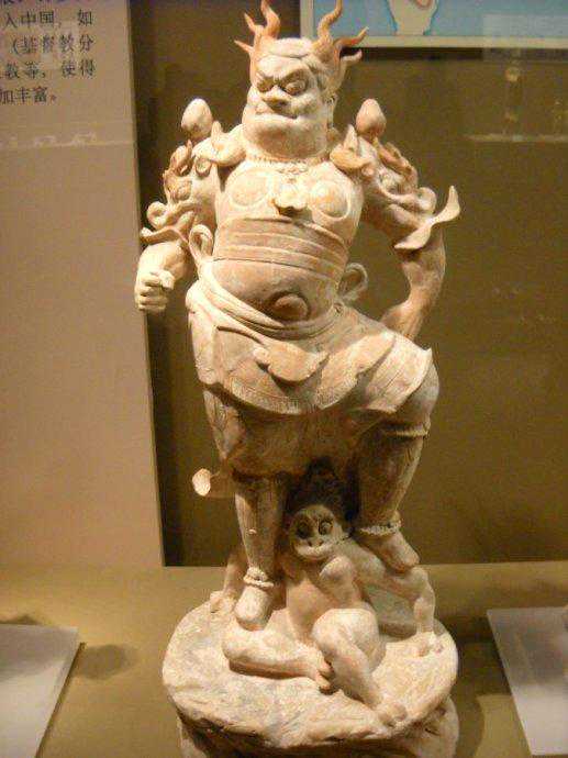 由于外来艺术的影响,天王俑表现出不同于单个人物、动物雕塑的显著特点,具有强烈的戏剧冲突和悲剧性。天王俑俨然是一个胜利者,他气宇轩昂,神态严峻,千钧之脚踩在小鬼身上。小鬼面目狰狞,虽已失去了嚣张气焰,但却不甘于被践踏的地位,极力挣扎,妄图推倒体魄巨大的天王俑。在塑造上,天王俑身体硕大,臂膀有力,身上的甲胄或贴塑或刻划透出他刚毅峻健的性格;小鬼的塑造简捷、朴素,以衬托天王的威武。通过大小,粗细的对比形成了完整统一的立体雕塑,给人留下庄严神圣之感。