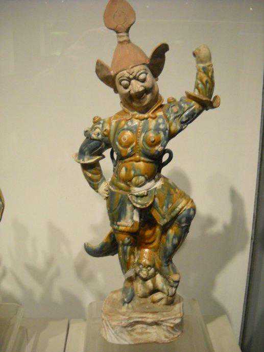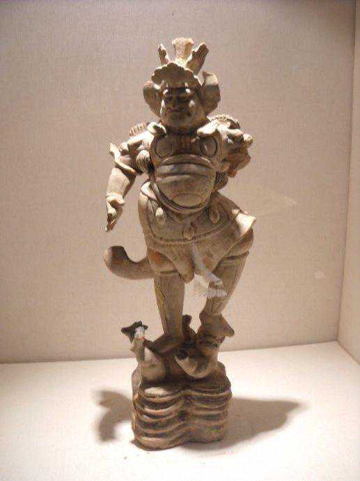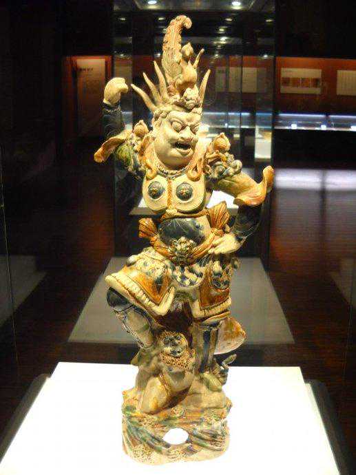 由于天王俑在墓中具有独特的作用,制作上也较精细,体量也较人物俑、动物俑大。彩绘三彩釉天王陶俑身穿铠甲,左手杈腰,右手高举,足下踏一跪着小鬼,它体现了主人希望阴间太平,不受鬼神侵扰的心愿。
