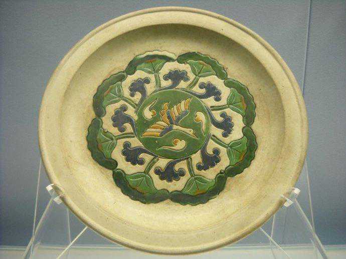 唐代三彩釉云雁纹三足陶盘
