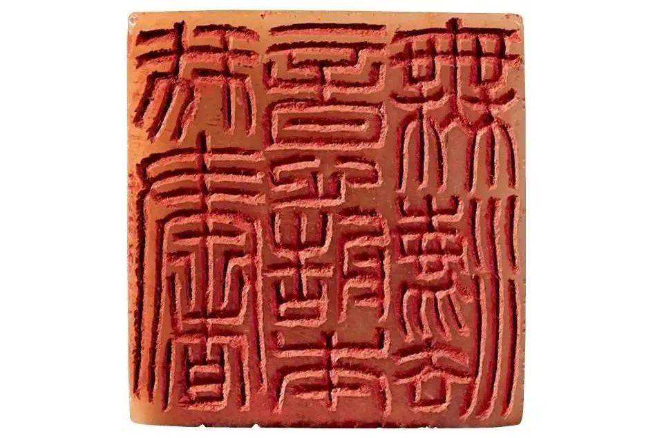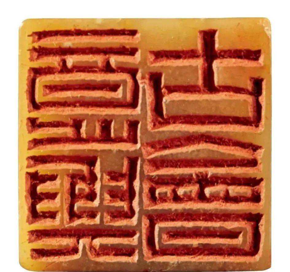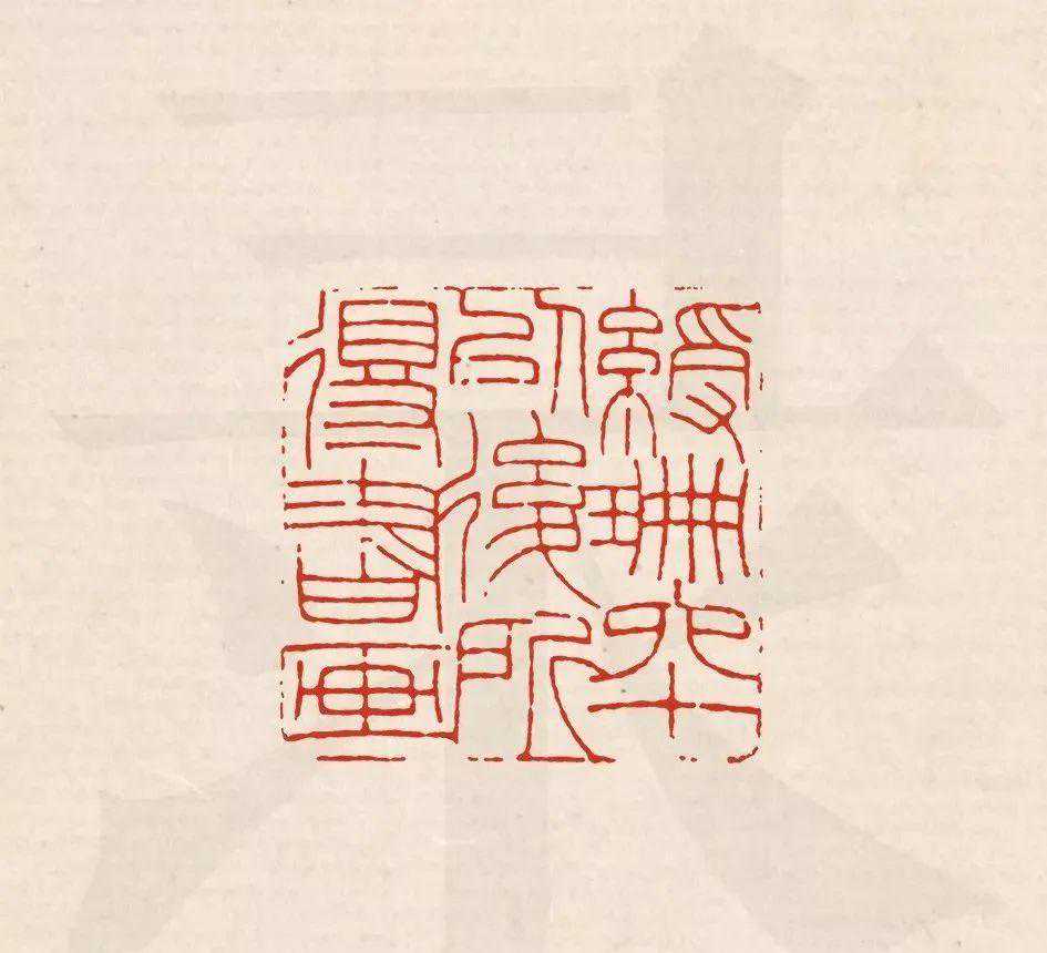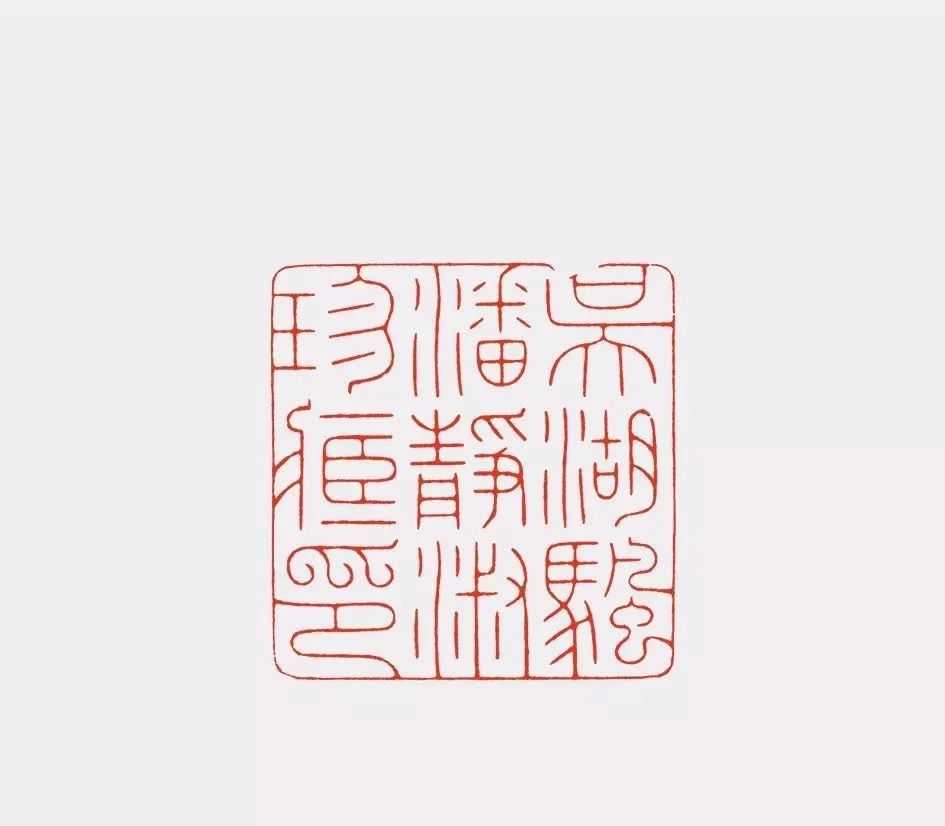 空间感上,陈巨来的文字处理更偏重安宁,比如他的九字印,“吴湖帆潘静淑珍藏”印,每一个字都是外方内圆,字与字,行与行之间有清晰的分界空隙。