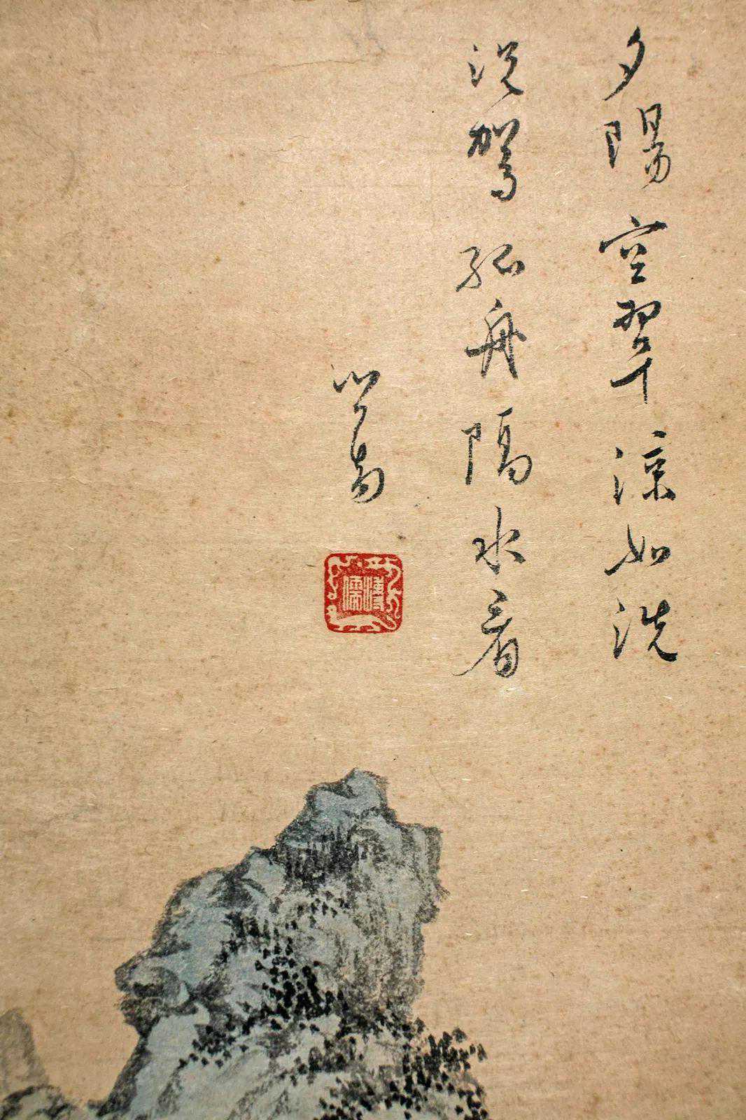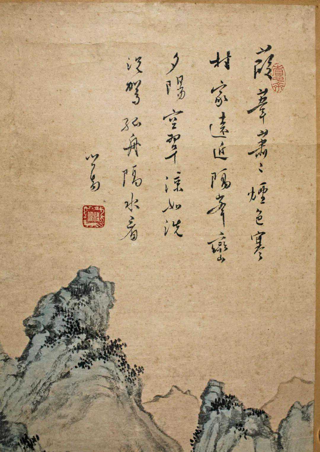款识:葭苇萧萧烟色寒,村家远近隔峰峦。夕阳空翠凉如洗,从驾孤舟隔水看。心畬。