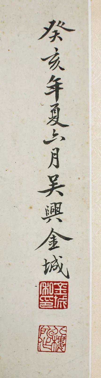 款识:庚申仲冬,儗钱罄室设色法。奉艾卿太傅鉴正,并申九如之祝。吴兴金城。