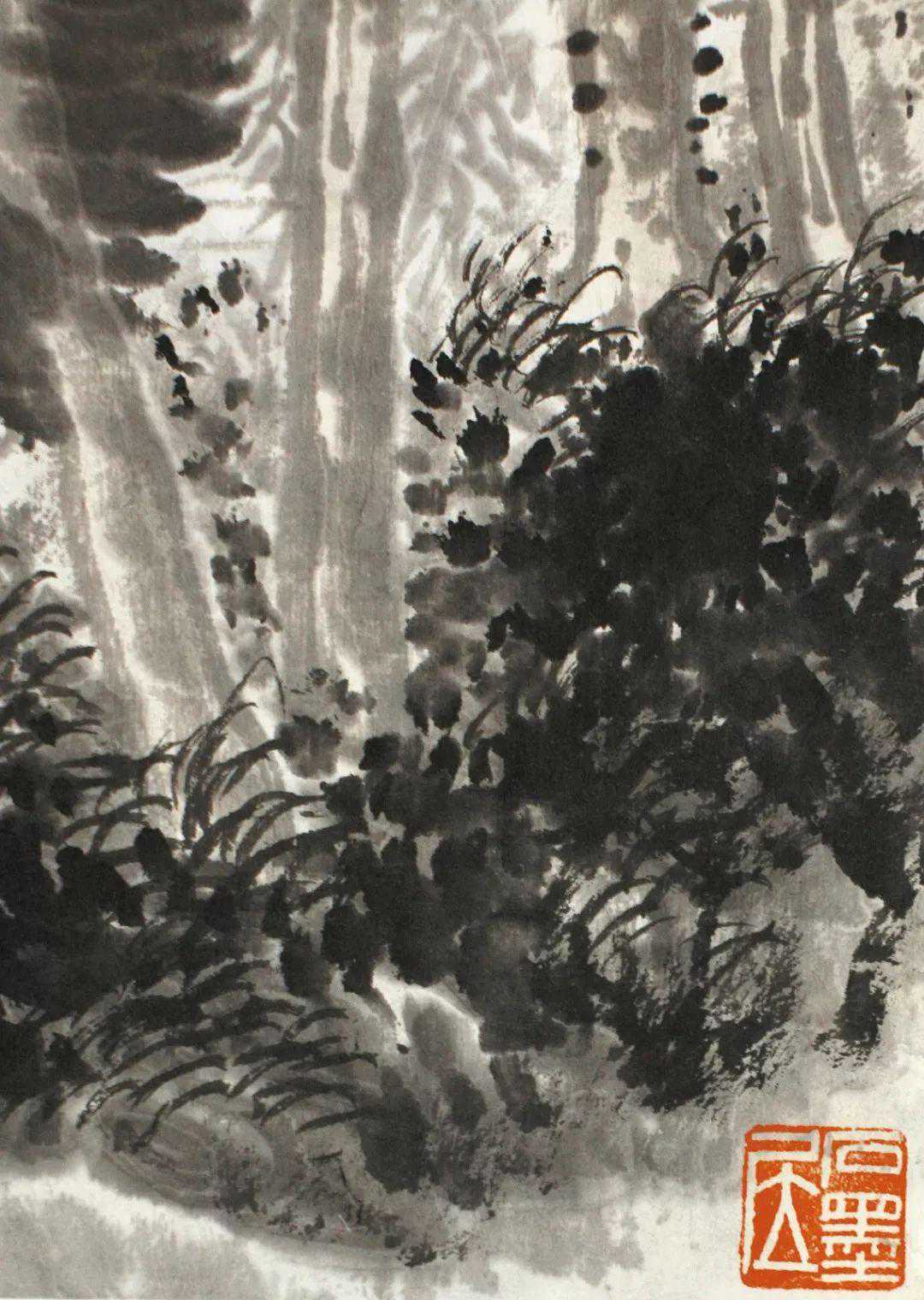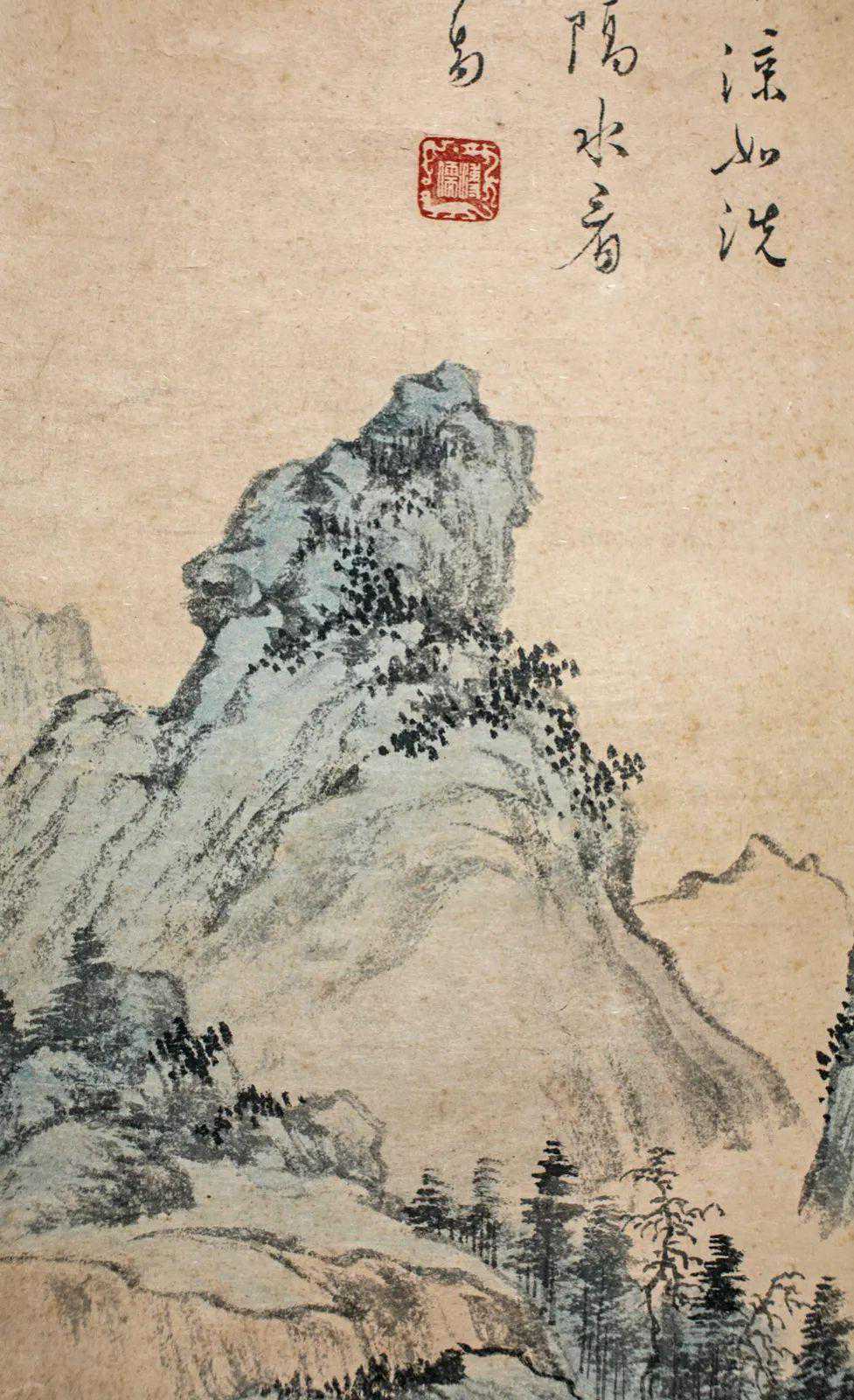 款识:丹崖百尺峙江干,古寺萧森耸翠峦。最爱松阴曲涧里,扁舟一棹任盘桓。拟清湘老人层峦烟嶂图大意。冷庵胡佩衡写于石墨居。