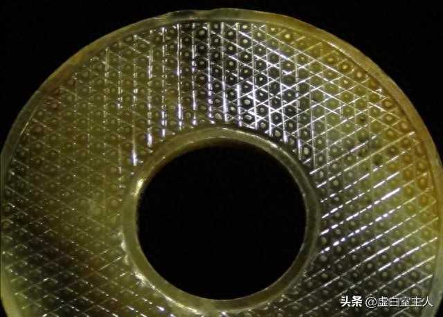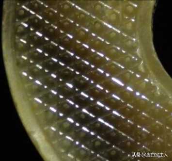 仔细观察,虽经精心设计琢制,形成蒲纹的交叉勾撤线槽微有宽窄,微弧现象,但非常自然。为人工无法克服的制作留痕,和作假的有意出错有本质的区别。