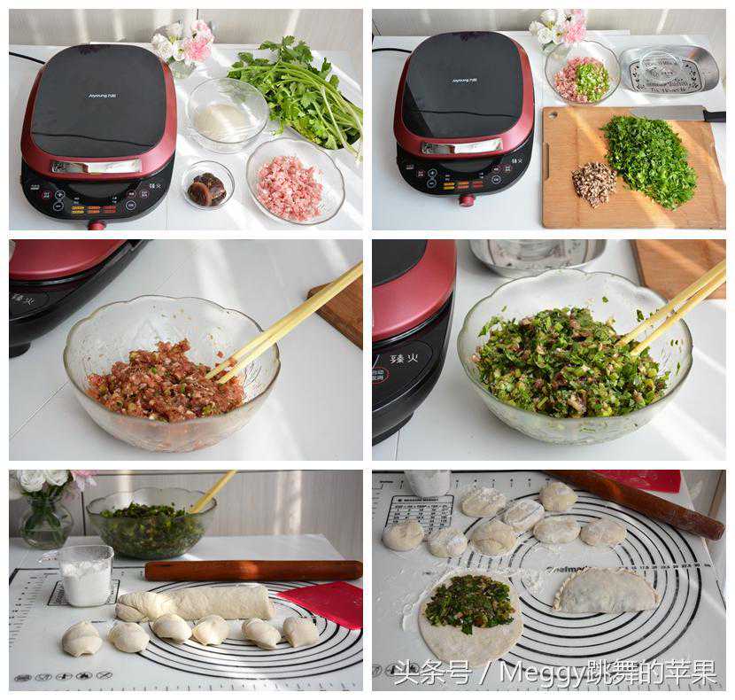 今天买了一棵大芹菜,绿油油的叶子惹人爱,放几个泡发的香菇,放点肉馅一搅拌,看,这薄皮大馅的饺子有10分钟就烙好了。