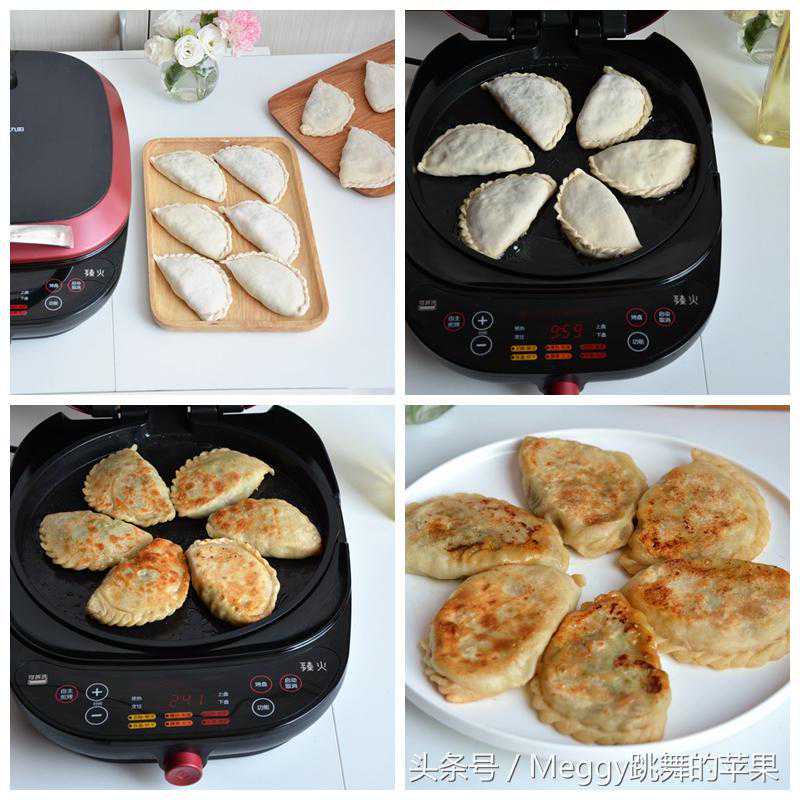 7.12个合子和馅料都用完了,电饼铛通电,选择“馅饼/披萨”程序,上下烤盘大火力加热,时间暂定12分钟;
