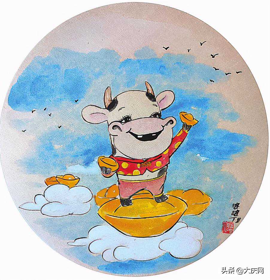 历经不平凡的子鼠旧岁,迎来崭新的丑牛新春。漫画家丁月光构思创作了这组以牛为主题的作品《五牛贺岁》,寓意一元复始、万象更新、金牛送福、五福临门。或腾云驾雾、携元宝而来,或从盈盈的春意中信步而来,亦或是牧童坐立于上,这组作品中的牛,颜色不一、姿态和神情各异。作者细腻的笔触,适当夸大了牛鼻,其中两幅还描绘了牛眼眶边缘的睫毛,让丑牛更富有灵性,也将作者渴盼春天、迎接春天的心情传达得淋漓尽致。