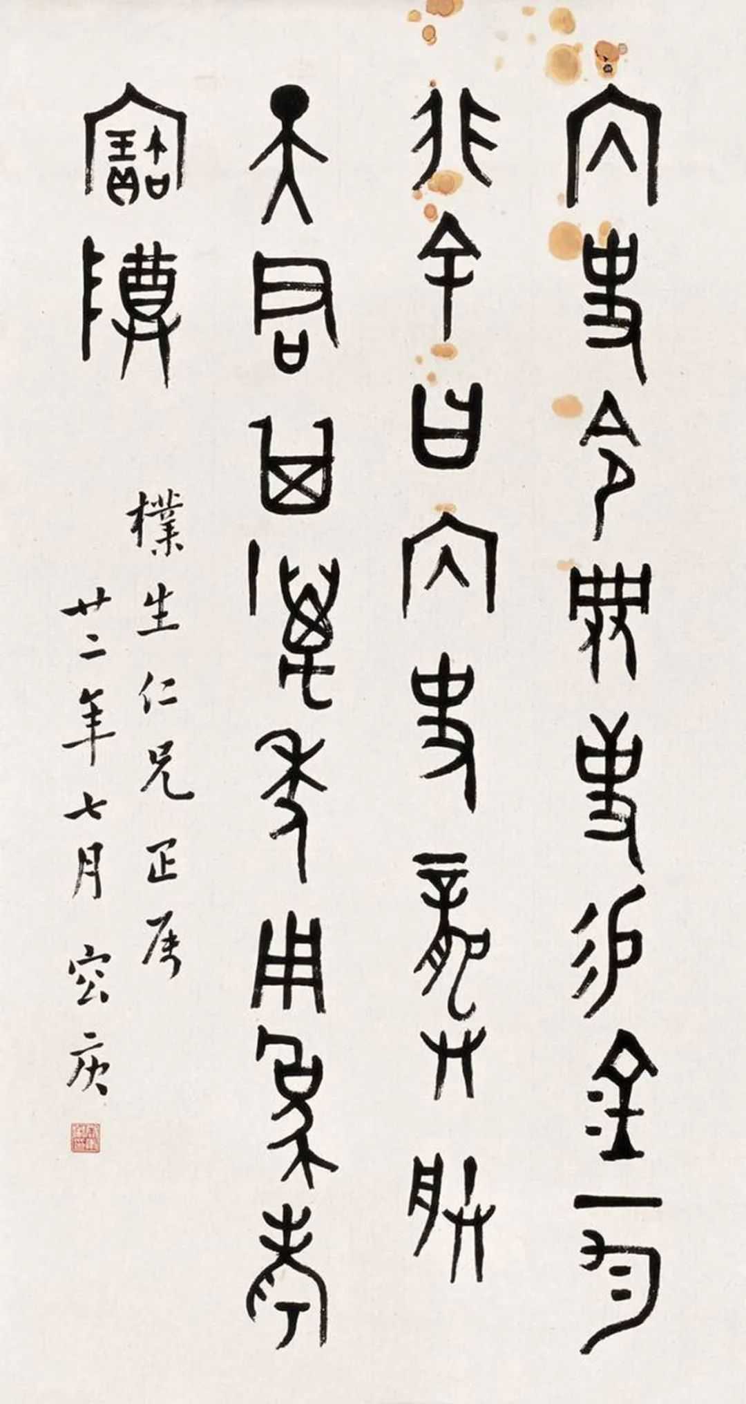 容庚书法,从小篆入手,学习小篆又以《说文》为宗,后接触金文、甲骨,遍临古文字名迹,而对彝器铭文探讨尤深,从巨器长铭到小件杂品上的辞例,只要是书体美好者,必多手摹心领,时而也间及汉代隶分诸体,旁及行草,而醉心最久,用功最多的还是金文,所以他的金文雍容典雅,浑穆高古。